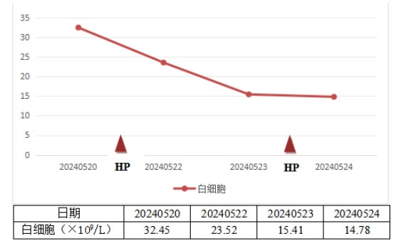患者白細胞計數(shù)在CRRT+HP+ECMO治療過程中顯著下降。
