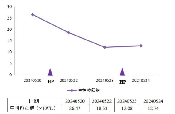 患者中性粒細胞計數(shù)在CRRT+HP+ECMO治療過程中顯著下降。