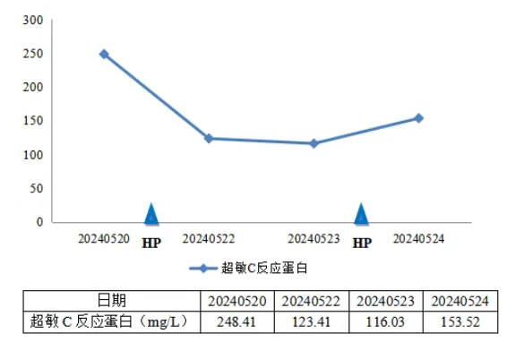患者超敏C反應(yīng)蛋白濃度在CRRT+HP+ECMO治療過程中顯著下降。